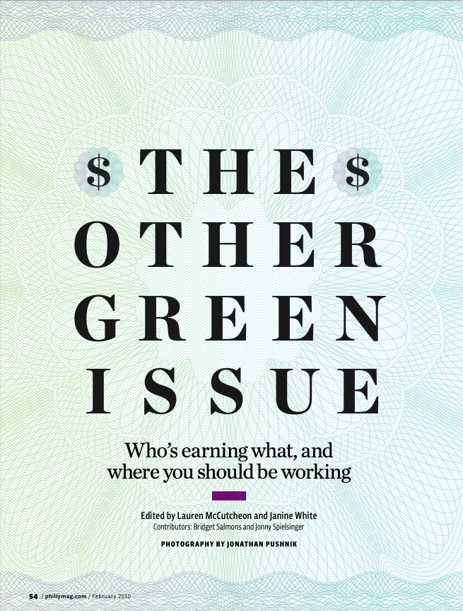 The Other Green Issue — Magazine feature package on money and careers in the city and suburbs. (Philadelphia magazine PDF)